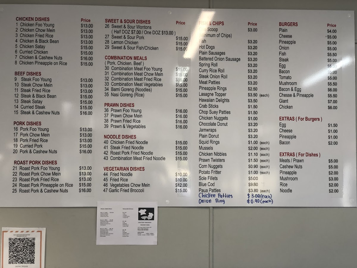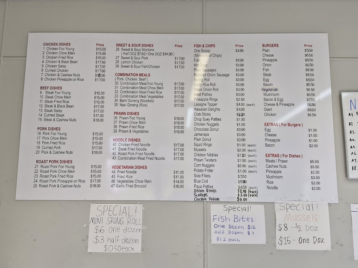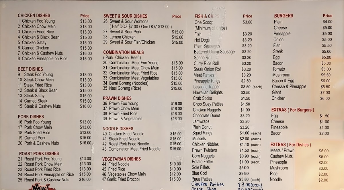 The menu at Junction Fish Supply offers a delightful mix of Chinese and New Zealand-inspired dishes, catering to various tastes. The Sweet & Sour section includes options like Sweet & Sour Pork, Lemon Chicken, and Sweet & Sour Fish/Chicken. For those craving a burger, choices such as Plain, Cheese, and Fish are available, along with unique variations like Pineapple Onion. Beef lovers can enjoy a variety of hearty dishes, including Steak Foo Young, Steak Chow Mein, Steak Fried Rice, Steak & Black Bean, and Steak Satay. Prawn enthusiasts can opt for the Prawn Chow Mein or Prawn Fried Rice. For extras, patrons can add Egg, Cheese, Pineapple, or Bacon to their meals. The Pork selection features comforting options like Pork Fried Rice, Curried Pork, and Pork & Cashew Nuts. Noodle dishes include favorites such as Chicken Fried Noodle, Steak Fried Noodle, Roast Pork Fried Noodle, and the well-loved Combination Meat Fried Noodle. Vegetarian options include Fried Rice, Vegetables Chow Mein, and Garlic Fried Broccoli. The Combination Meals section introduces dishes like Combination Meat Vegetables, Bami Goreng, and Nasi Goreng. Newer items on the menu include the Black Pepper Beef, Spicy Chicken, and Mushroom Beef On Rice, along with crispy Deep Fried Dumplings. The menu also features classic snack options like Hot Dogs, Plain Sausages, Battered Onion Sausages, Spring Rolls, and Curry Rice Rolls, ensuring there’s something for everyone. With such a diverse offering, Junction Fish Supply promises a satisfying experience for all tastes.
